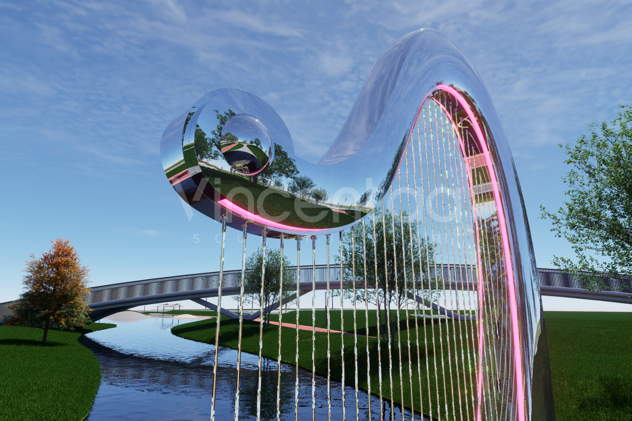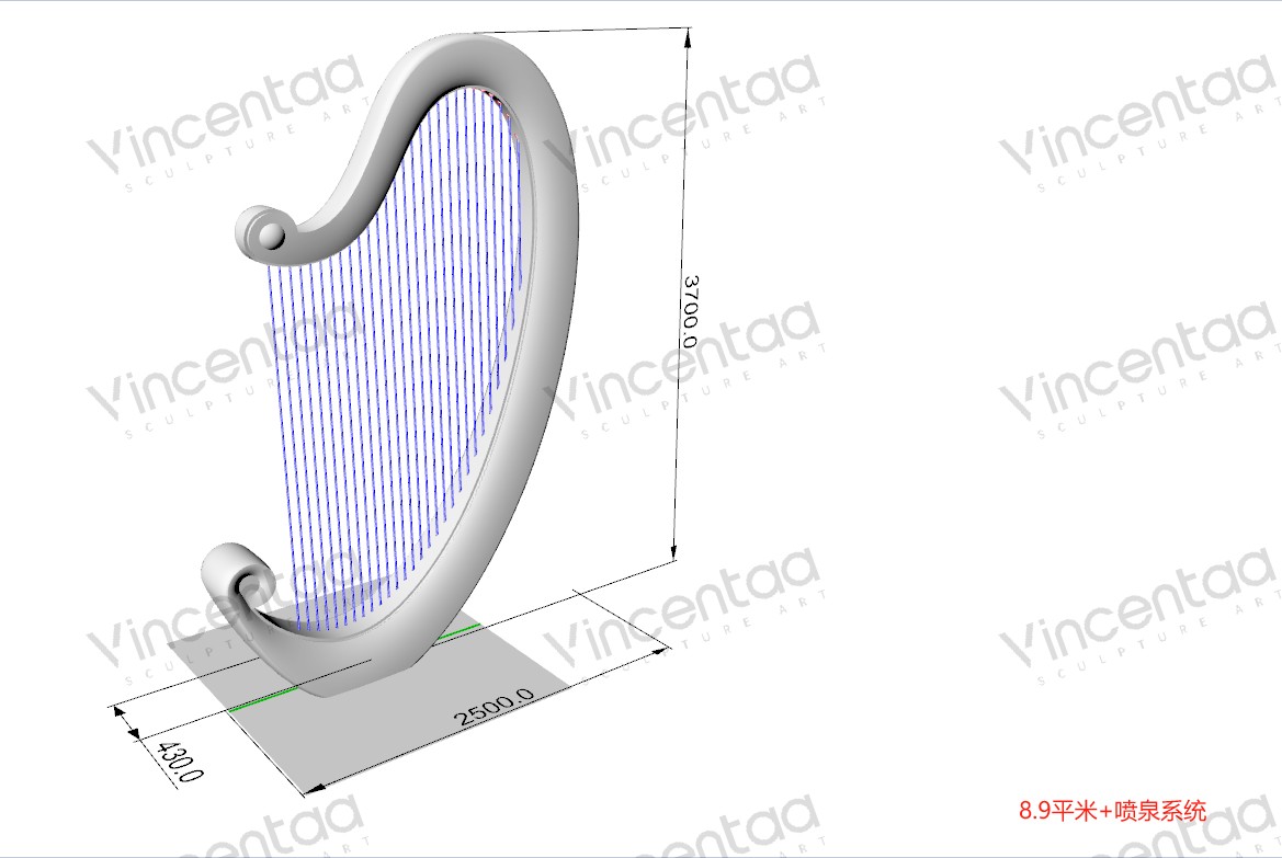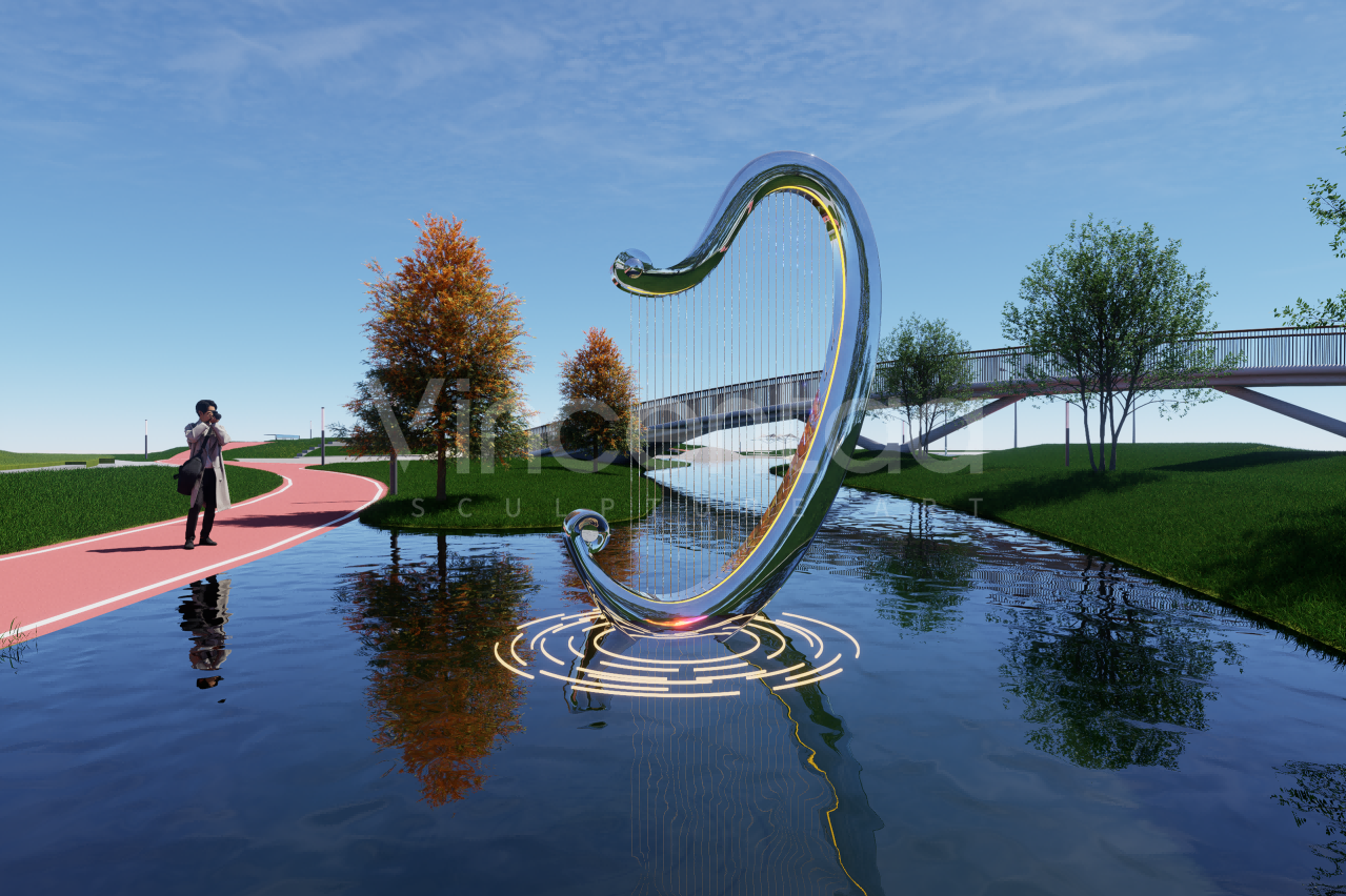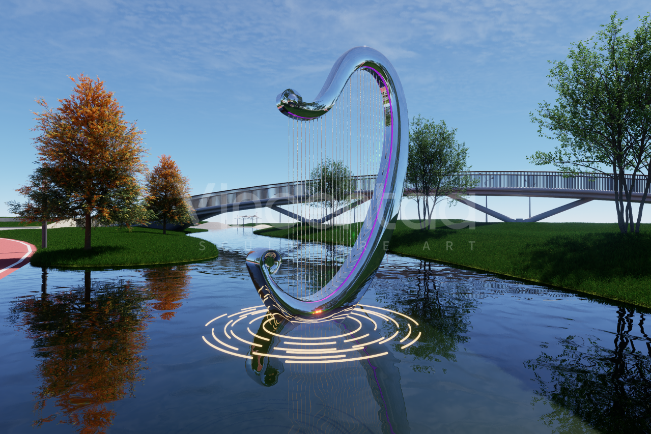 Эта скульптура-фонтан в виде арфы, созданная Винсентаа, сочетает в себе элегантность древнего инструмента и инновационность современного искусства, воплощая глубокий символизм музыки, искусства и культуры. Дизайн вдохновлен изящными изгибами арфы и элементом воды. Струны каскадом спускаются сверху, а поверхность воды, казалось бы, исполняет симфонию жизни, плавно стекая от источника струн к спокойному бассейну внизу. По мере распространения музыки по поверхности воды распространяются ряби, напоминающие ноты, плывущие в воздухе.