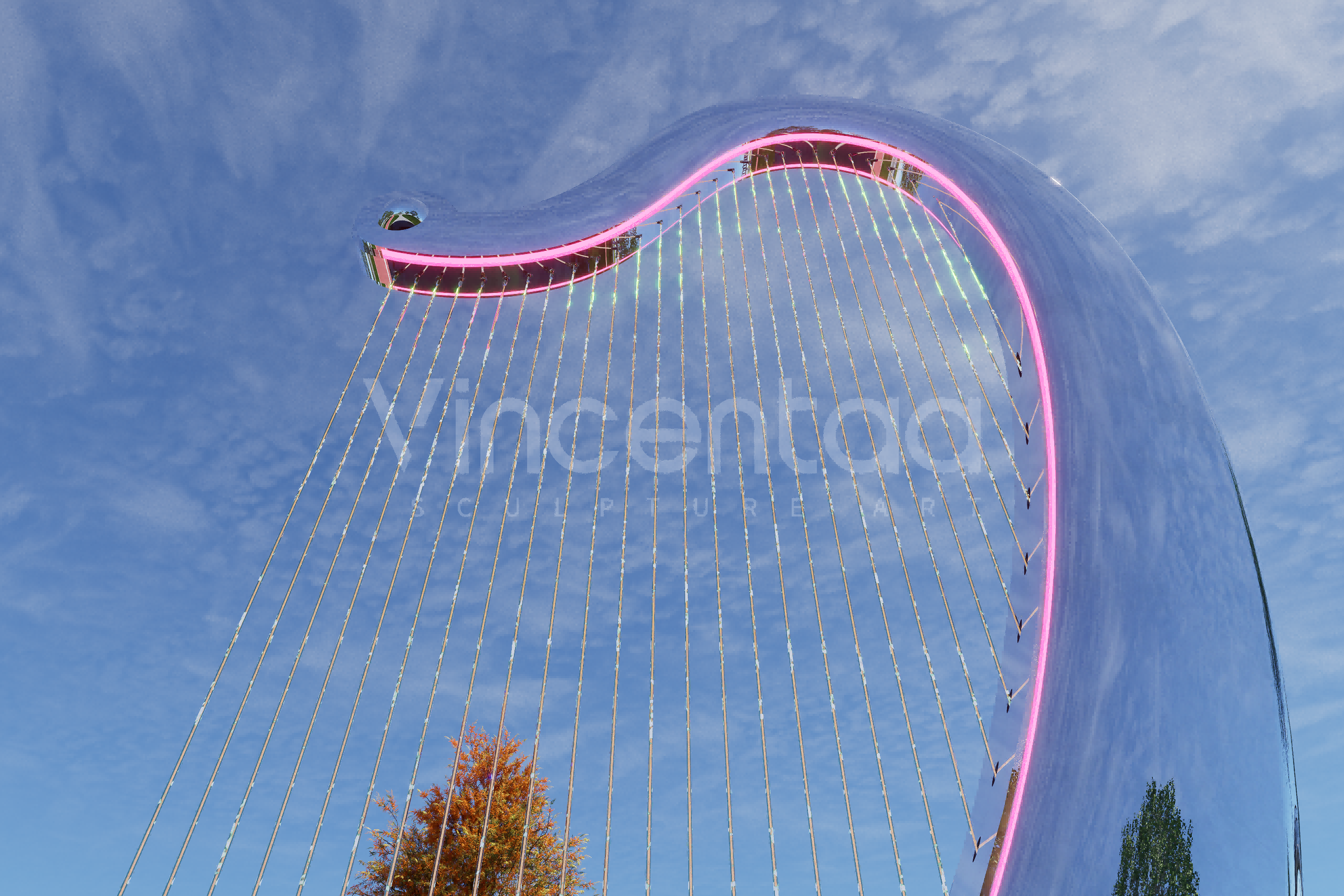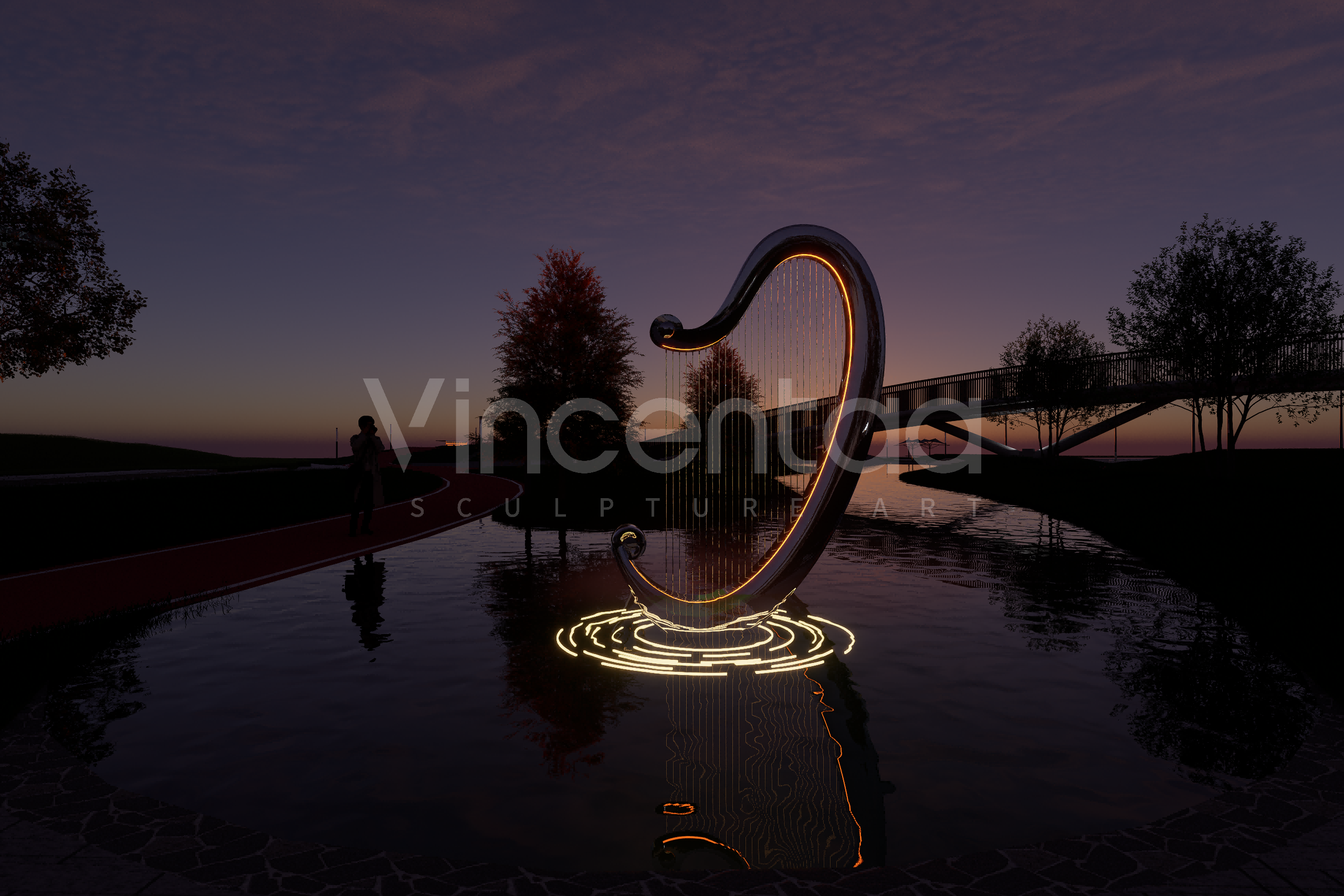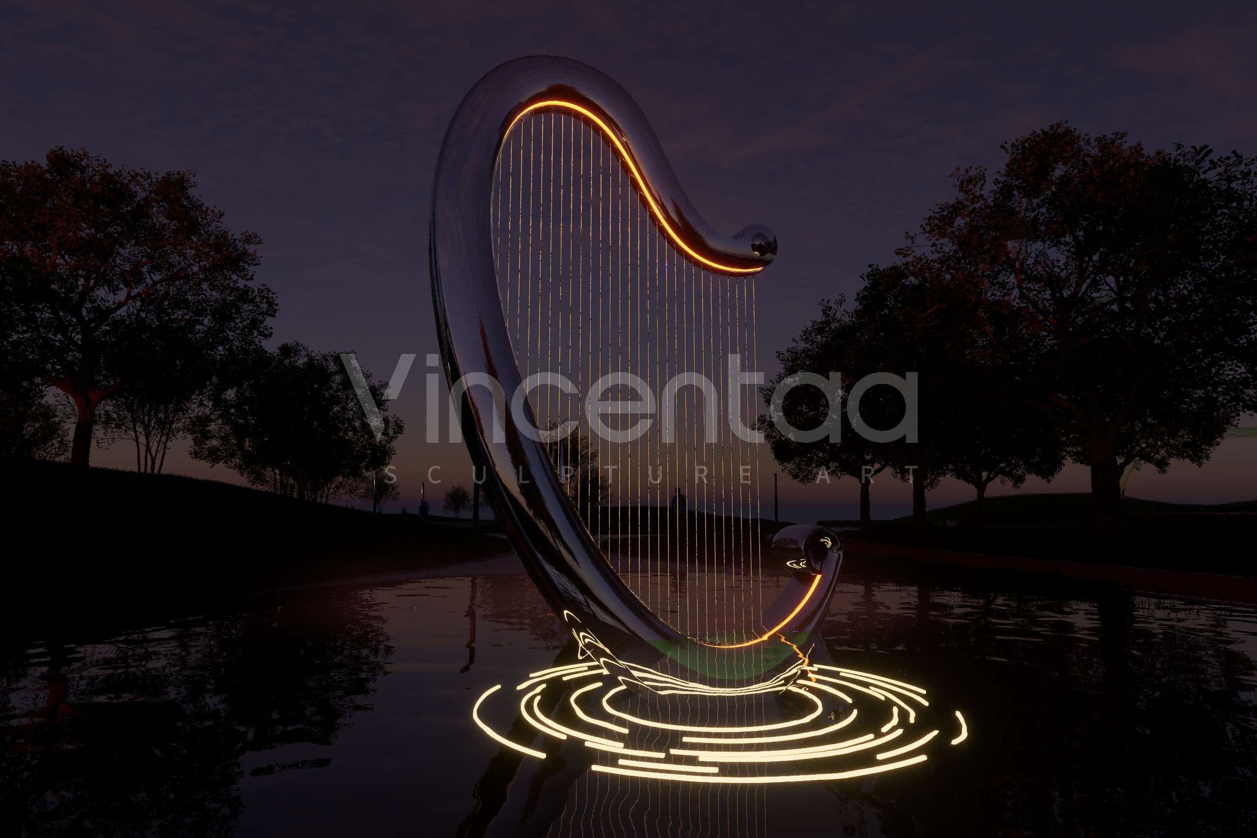 Эта скульптура-фонтан в виде арфы, созданная Винсентаа, сочетает в себе элегантность древнего инструмента и инновационность современного искусства, воплощая глубокий символизм музыки, искусства и культуры. Дизайн вдохновлен изящными изгибами арфы и элементом воды. Струны каскадом спускаются сверху, а поверхность воды, казалось бы, исполняет симфонию жизни, плавно стекая от источника струн к спокойному бассейну внизу. По мере распространения музыки по поверхности воды распространяются ряби, напоминающие ноты, плывущие в воздухе.