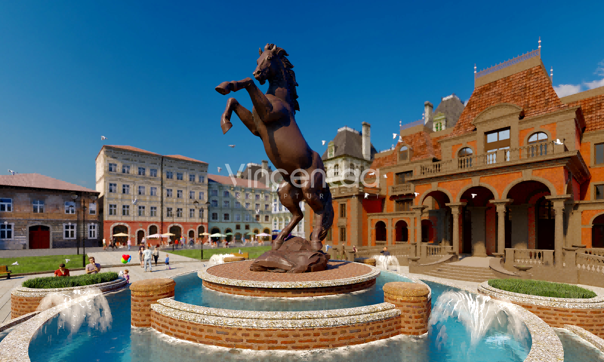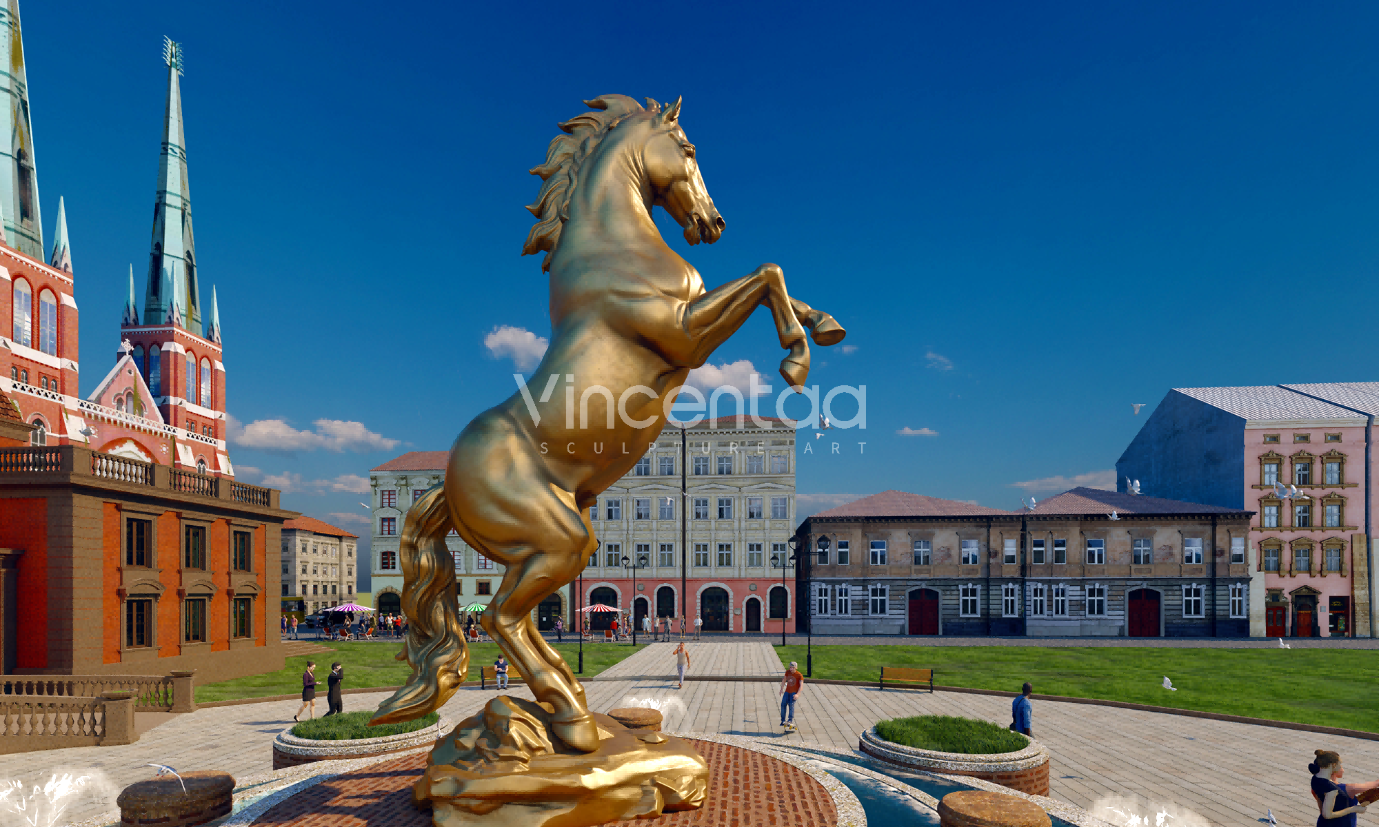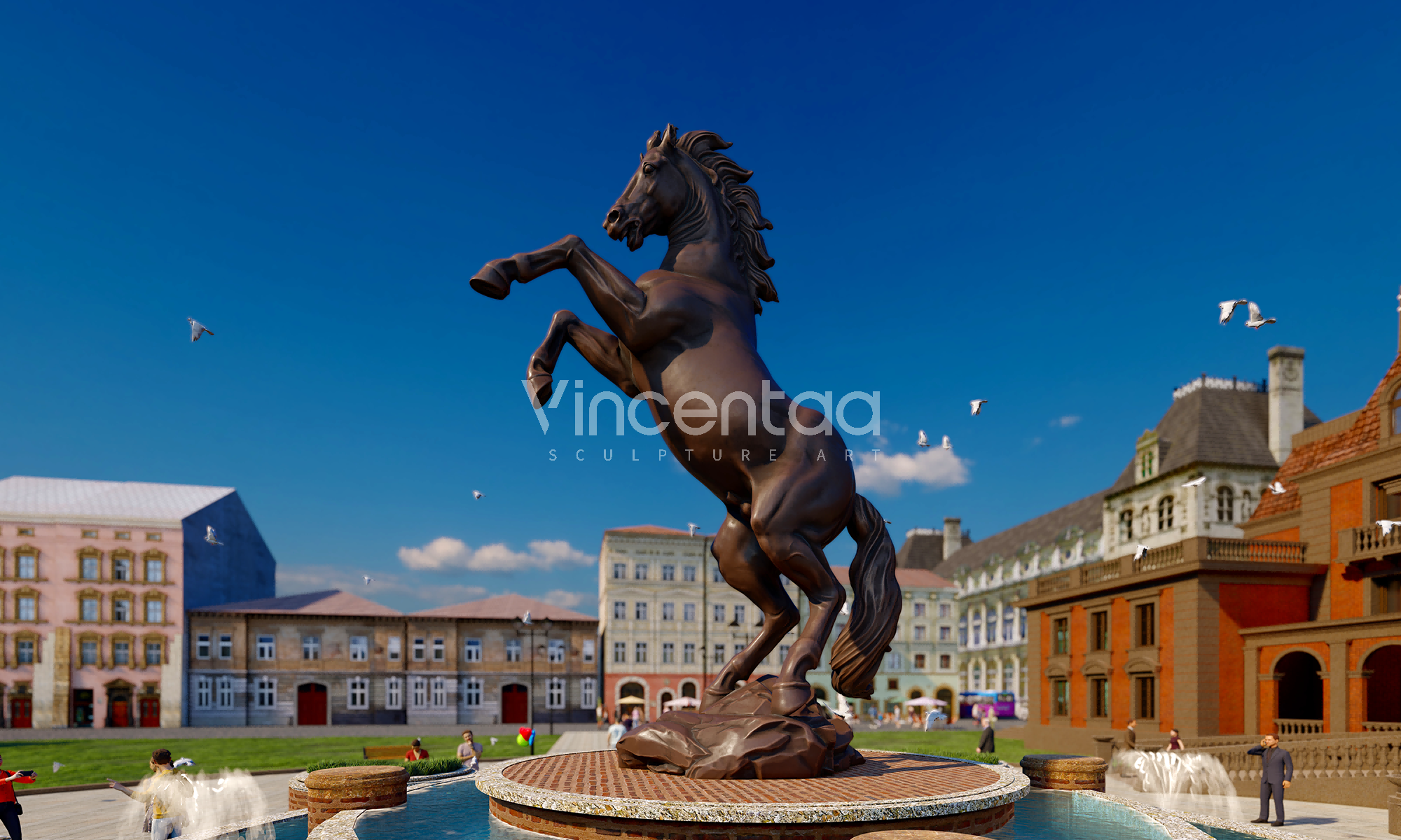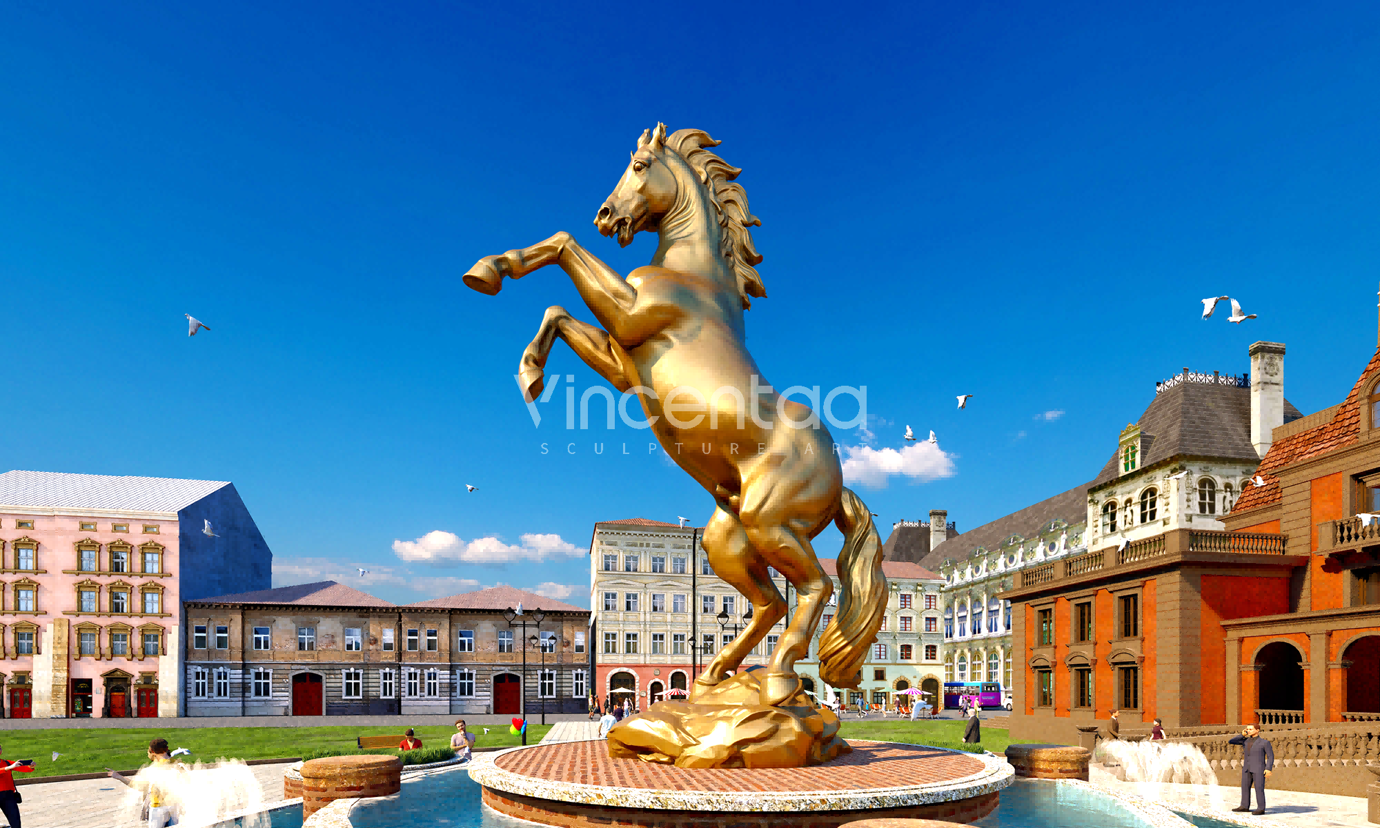 Эта группа бронзовых скульптур лошадей тщательно изготовлена фабрикой Vincentaa Sculpture Factory, имеющей более чем десятилетний опыт. Она демонстрирует динамичную позу лошади, мчащейся галопом и прыгающей, полную силы и жизненной энергии, словно лошадь, путешествующая во времени и пространстве. Скульптуры отлиты из высококачественной меди, которая устойчива к воздействию погодных условий и излучает классический металлический блеск. Она может выдерживать воздействие ветра и солнца и подходит для длительной экспозиции на открытом воздухе.
