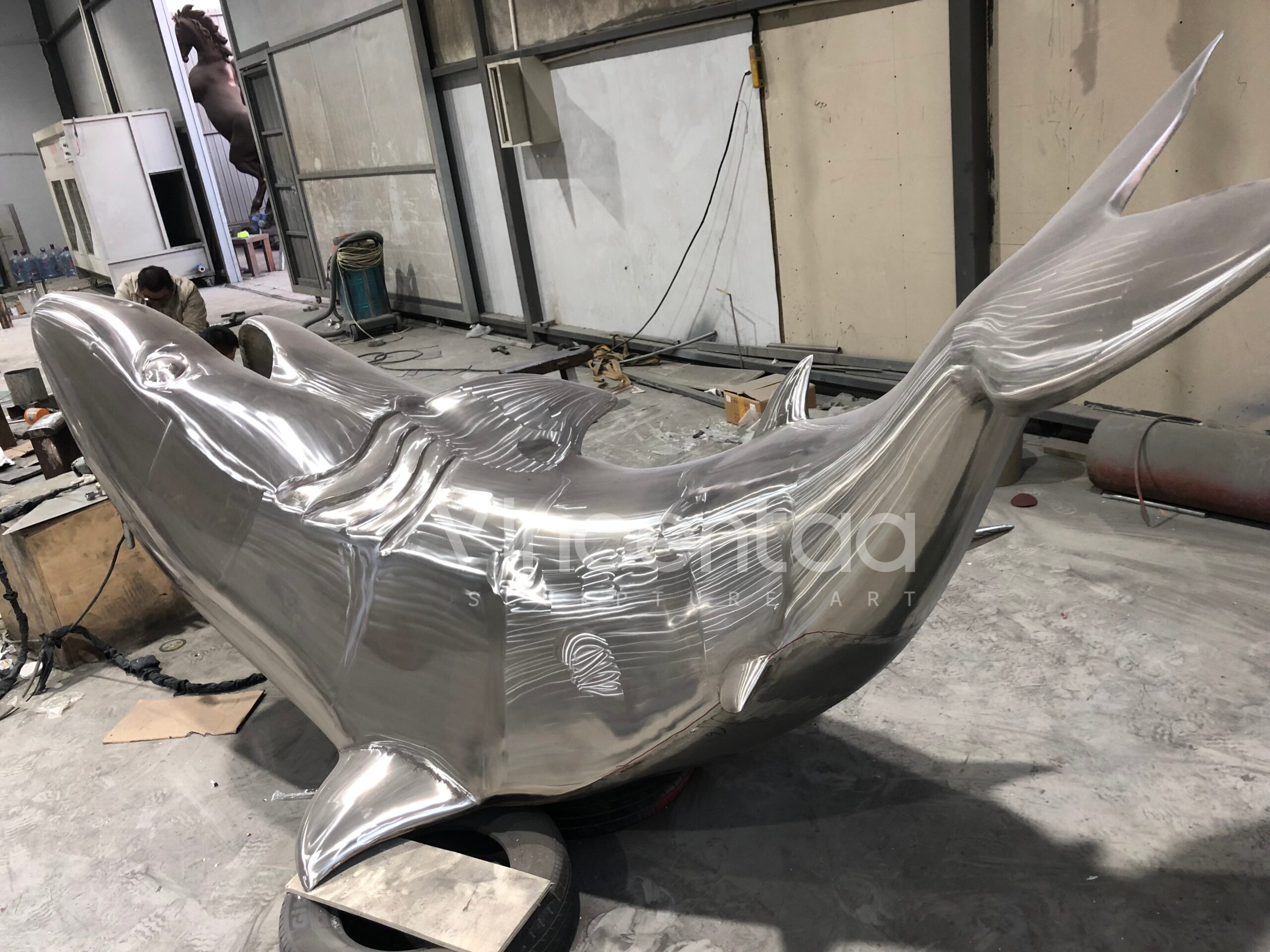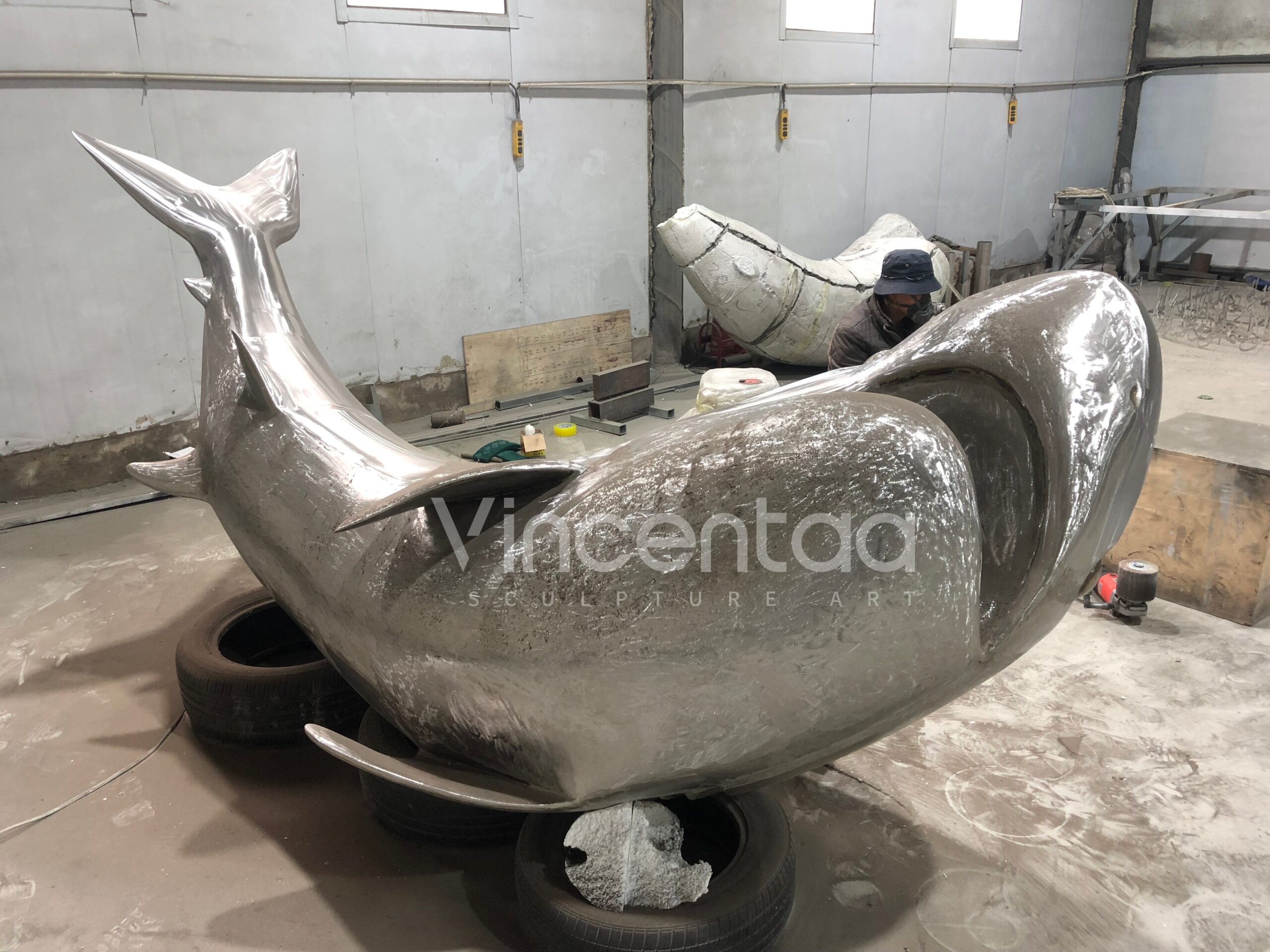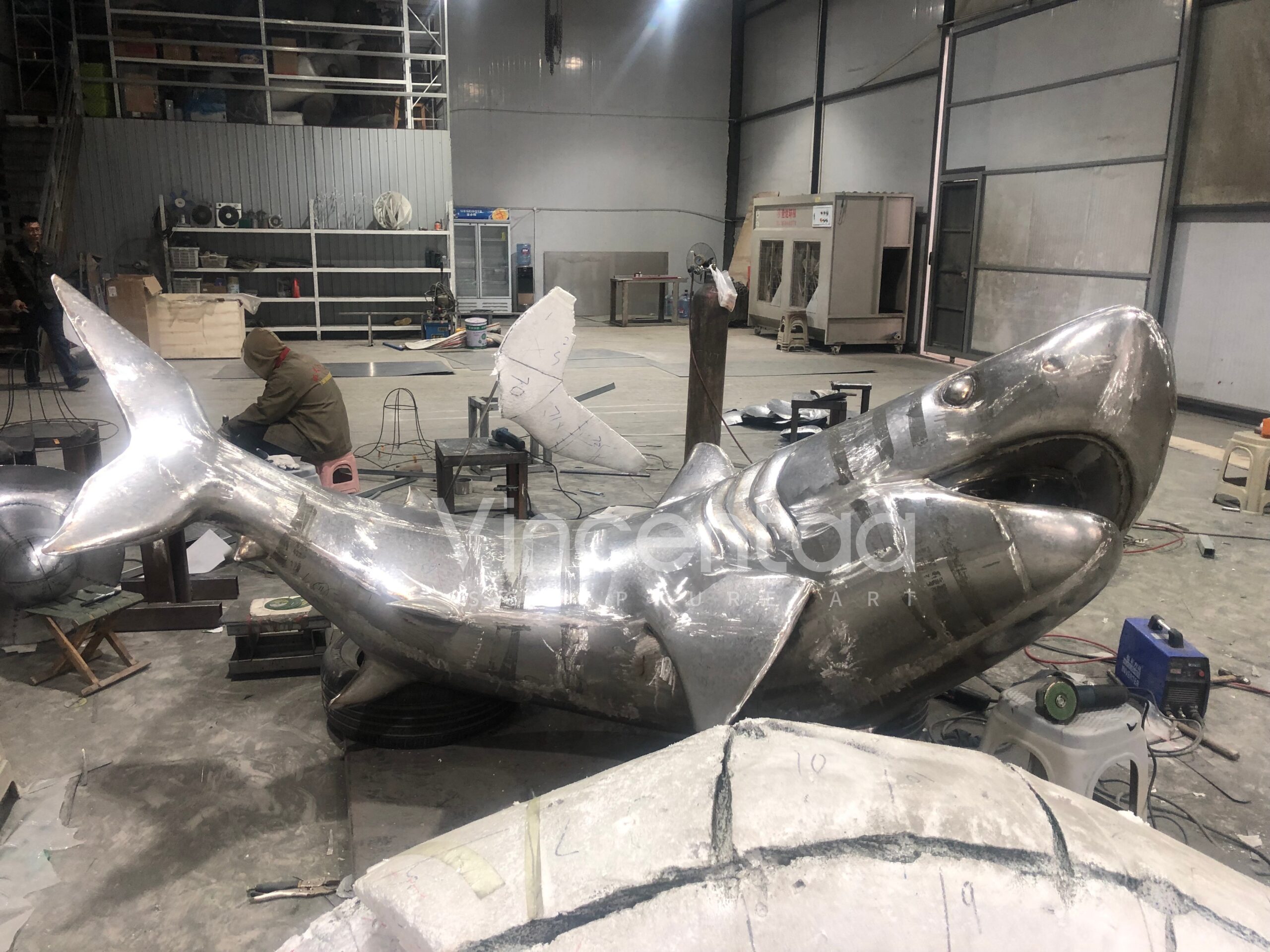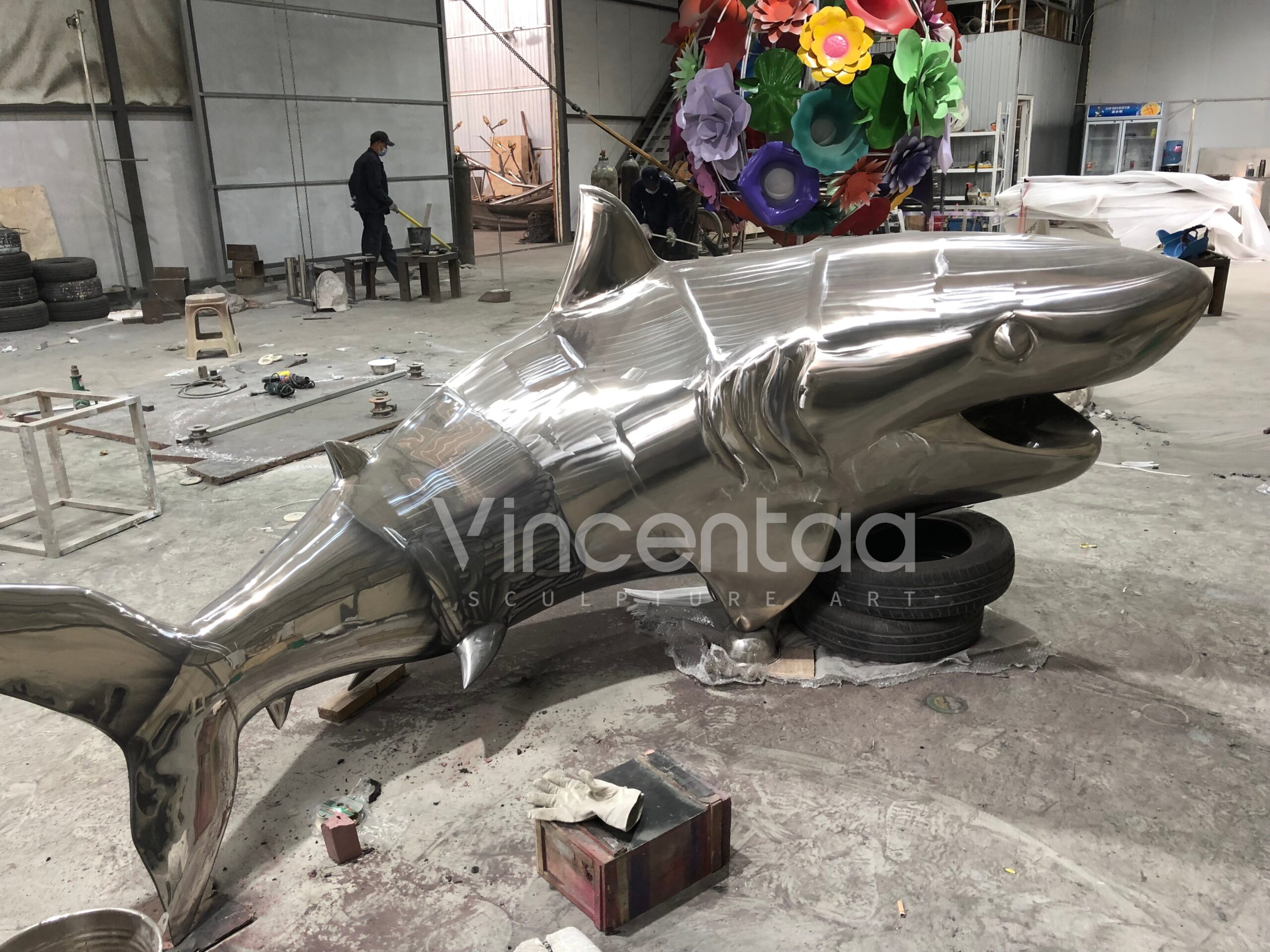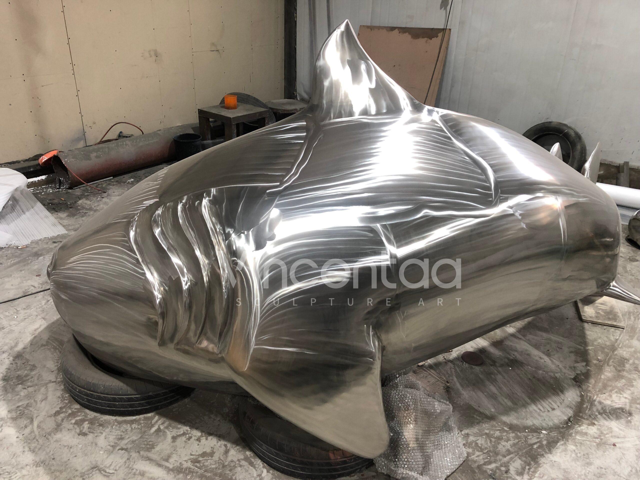 Это скульптура из нержавеющей стали на тему акул. Общие линии скульптуры плавные, а форма полна силы, что позволяет передать динамическую красоту акулы. В изделии использована технология зеркальной полировки, поверхность гладкая, как зеркало, что позволяет отражать окружающий свет и окружающую среду, усиливая визуальный эффект.