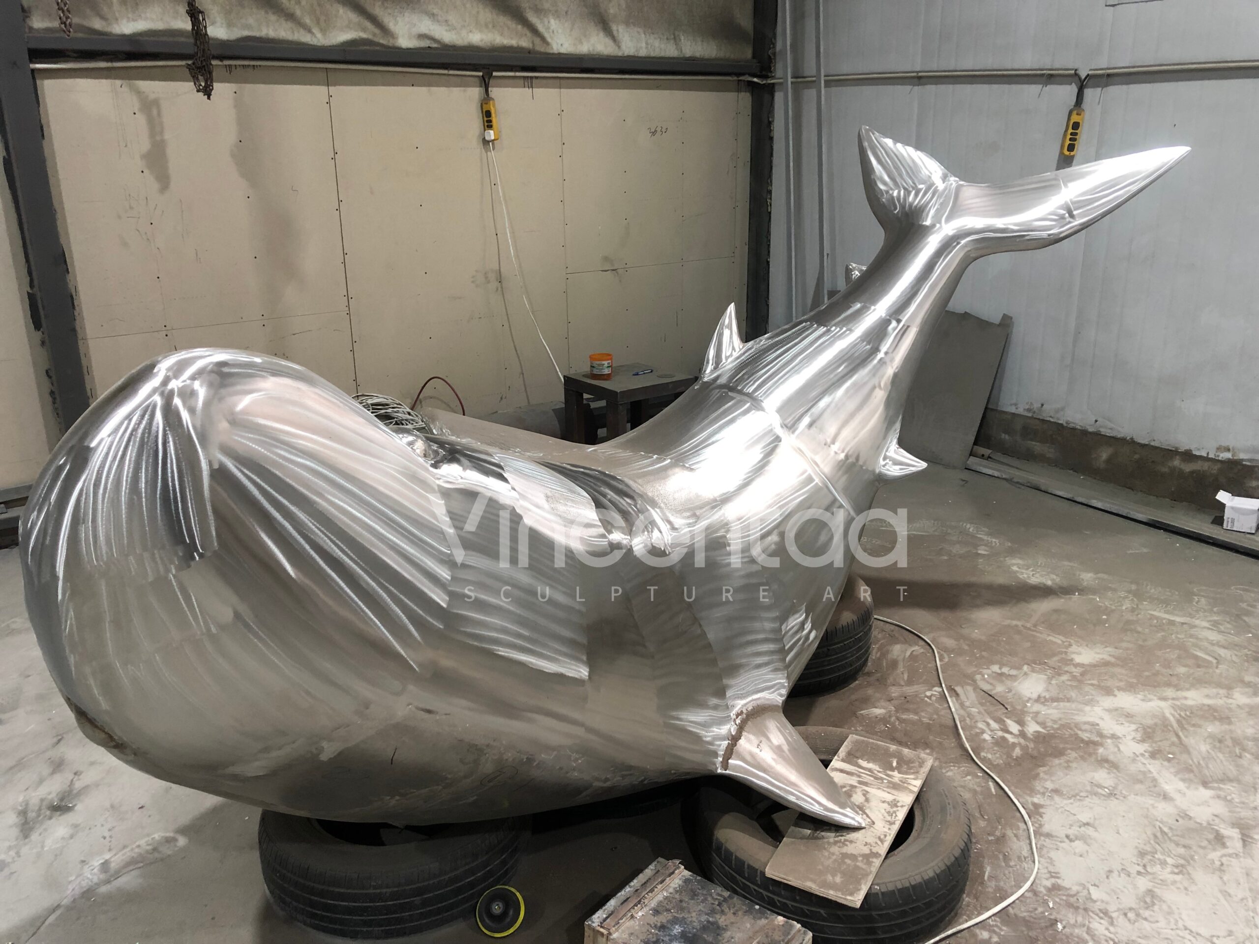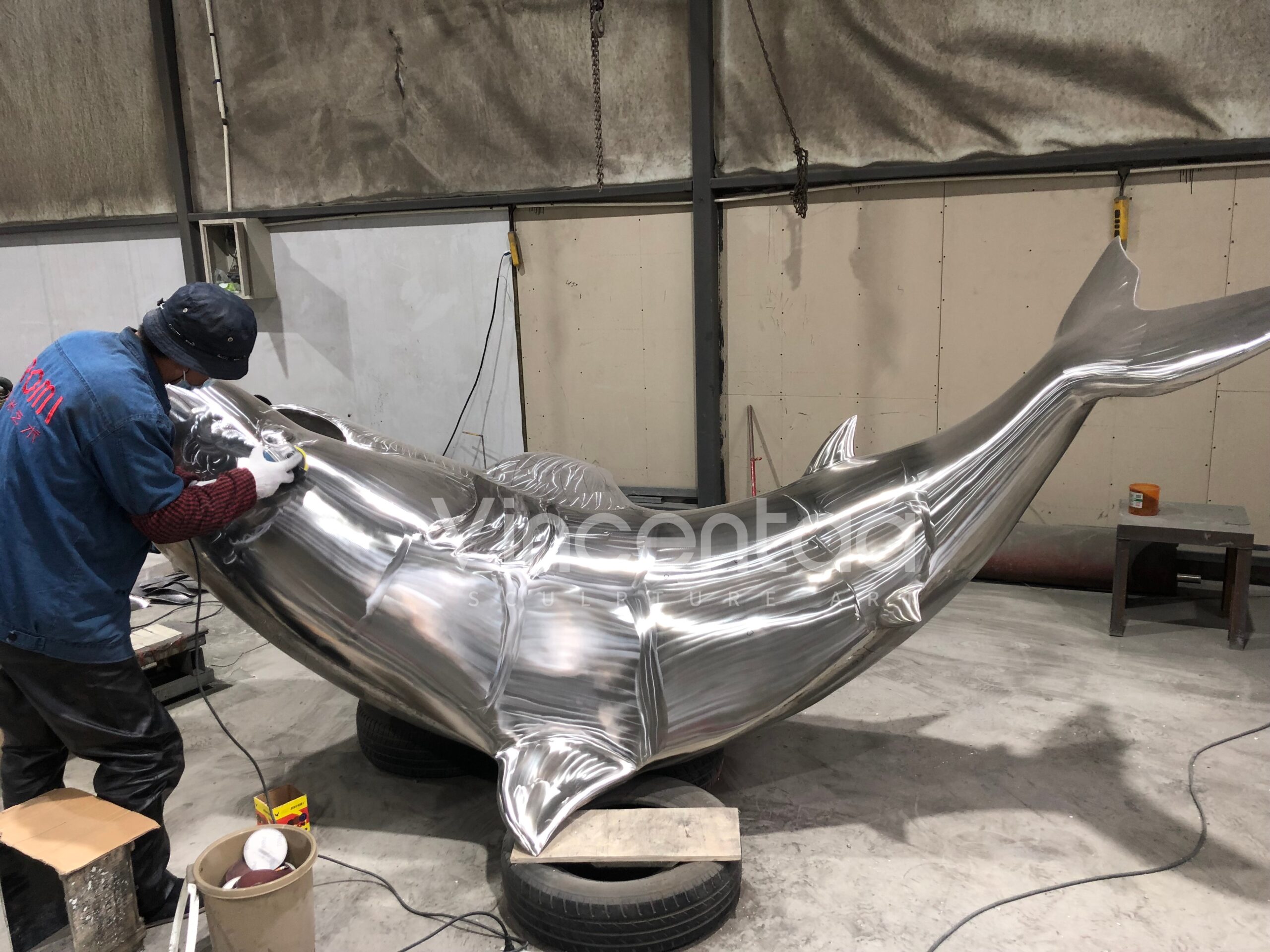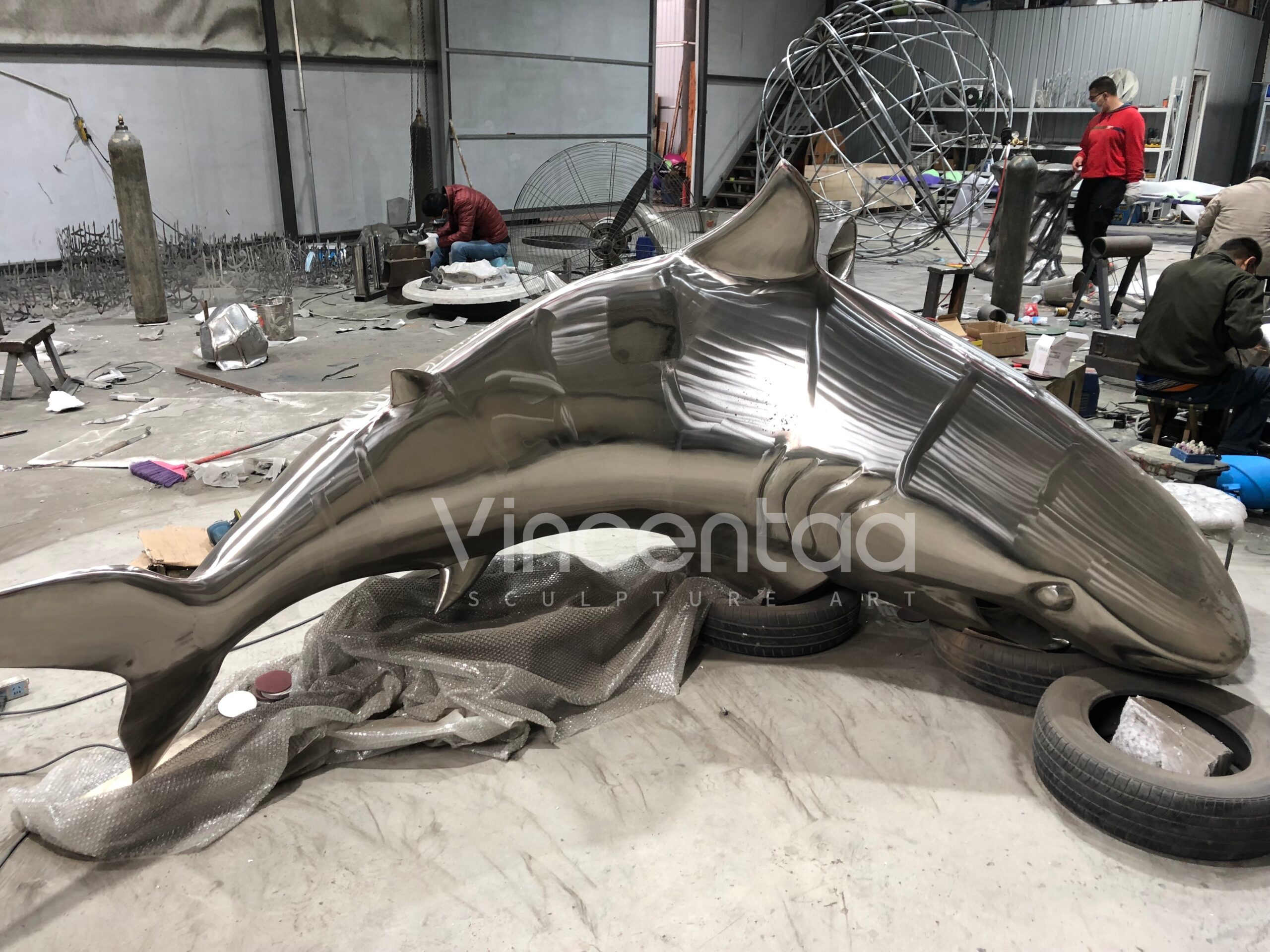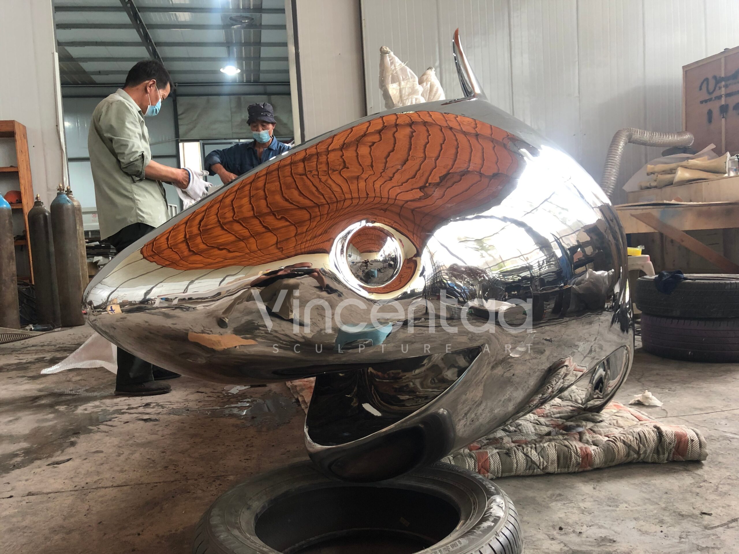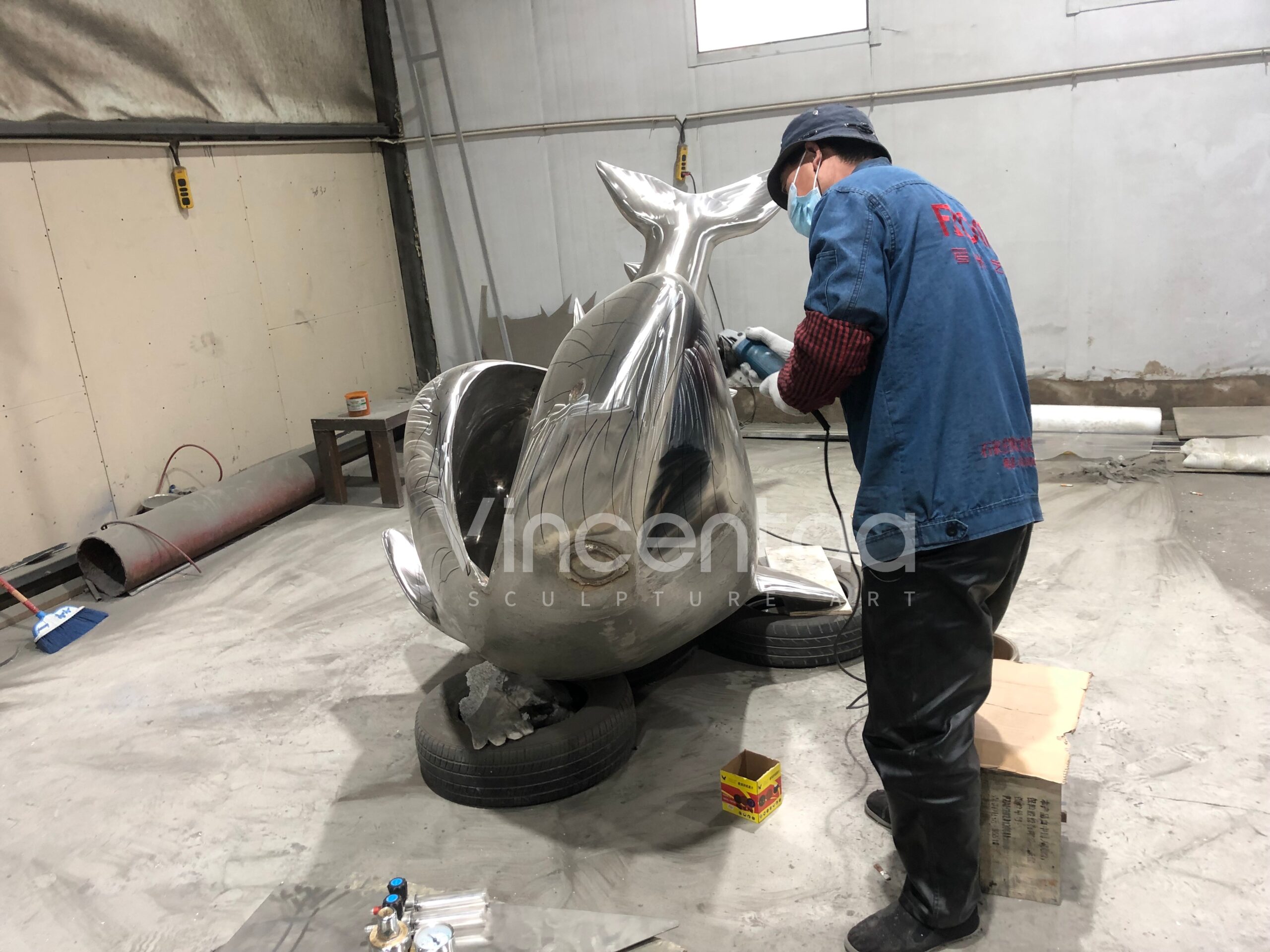 Это скульптура из нержавеющей стали на тему акул. Общие линии скульптуры плавные, а форма полна силы, что позволяет передать динамическую красоту акулы. В изделии использована технология зеркальной полировки, поверхность гладкая, как зеркало, что позволяет отражать окружающий свет и окружающую среду, усиливая визуальный эффект.