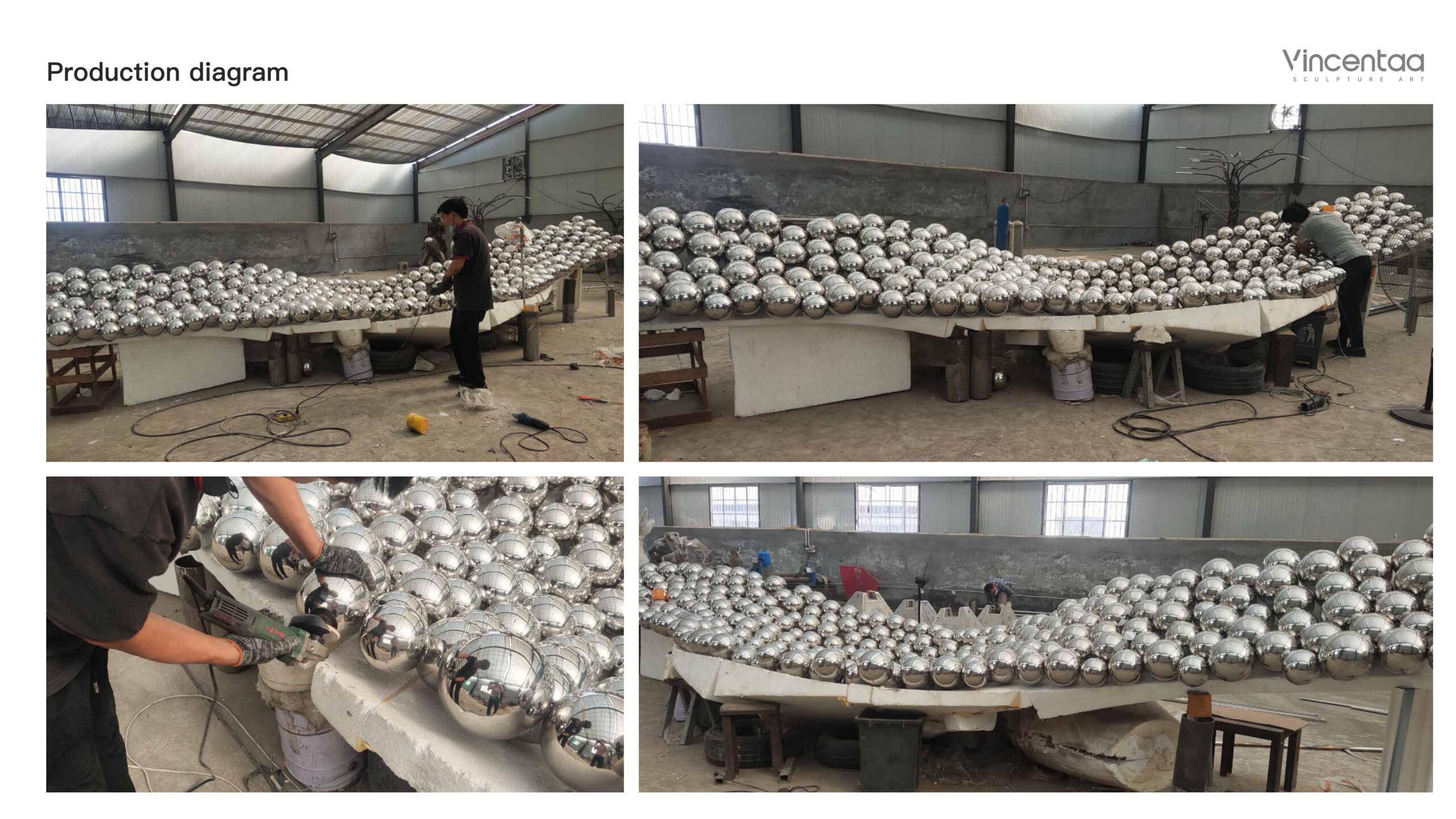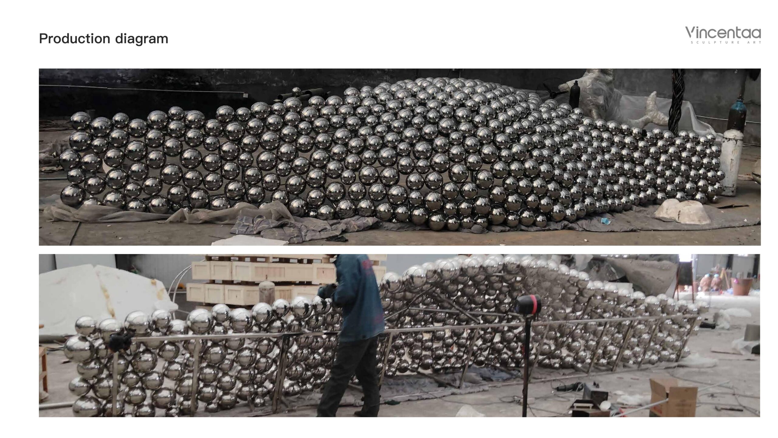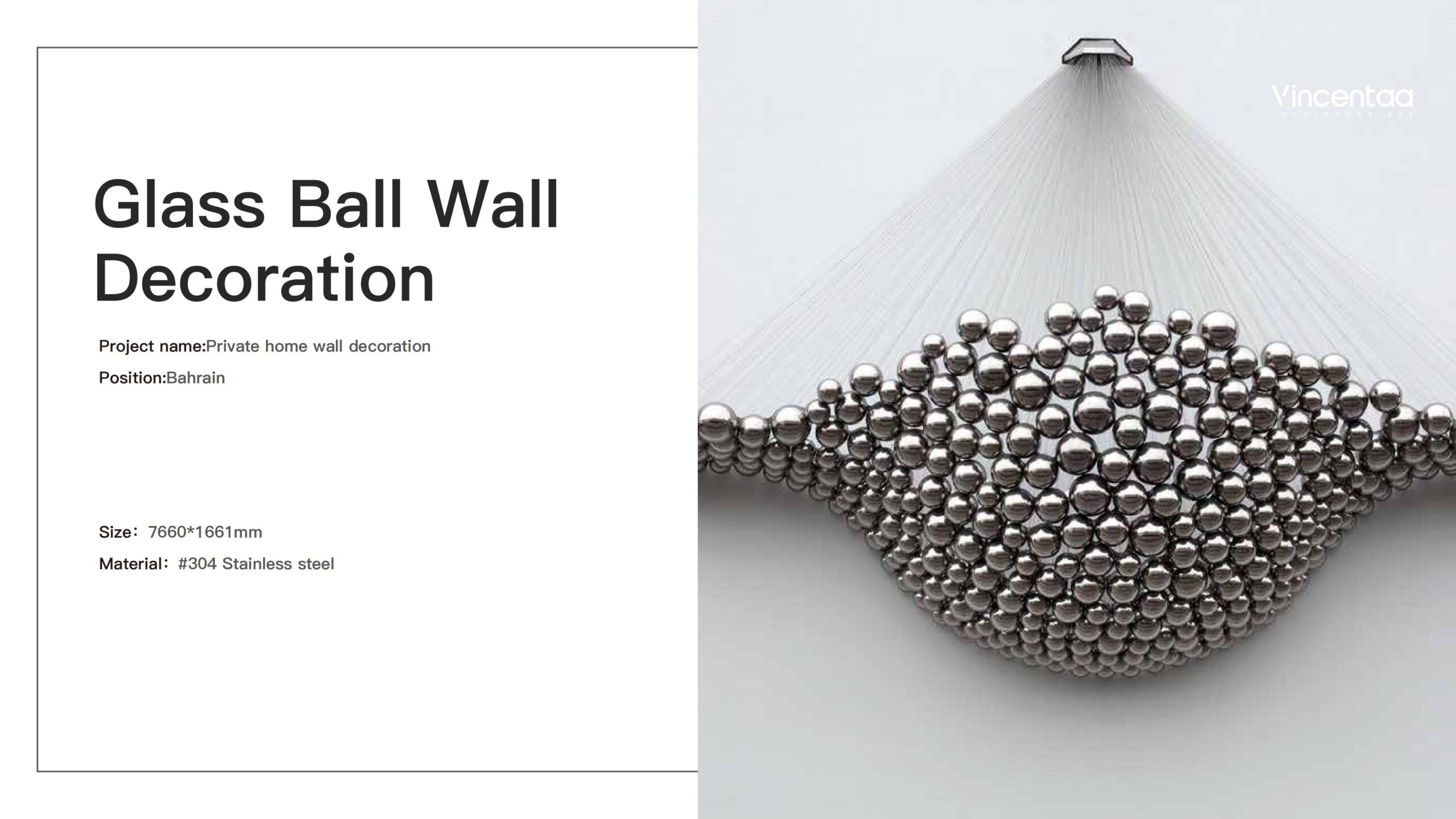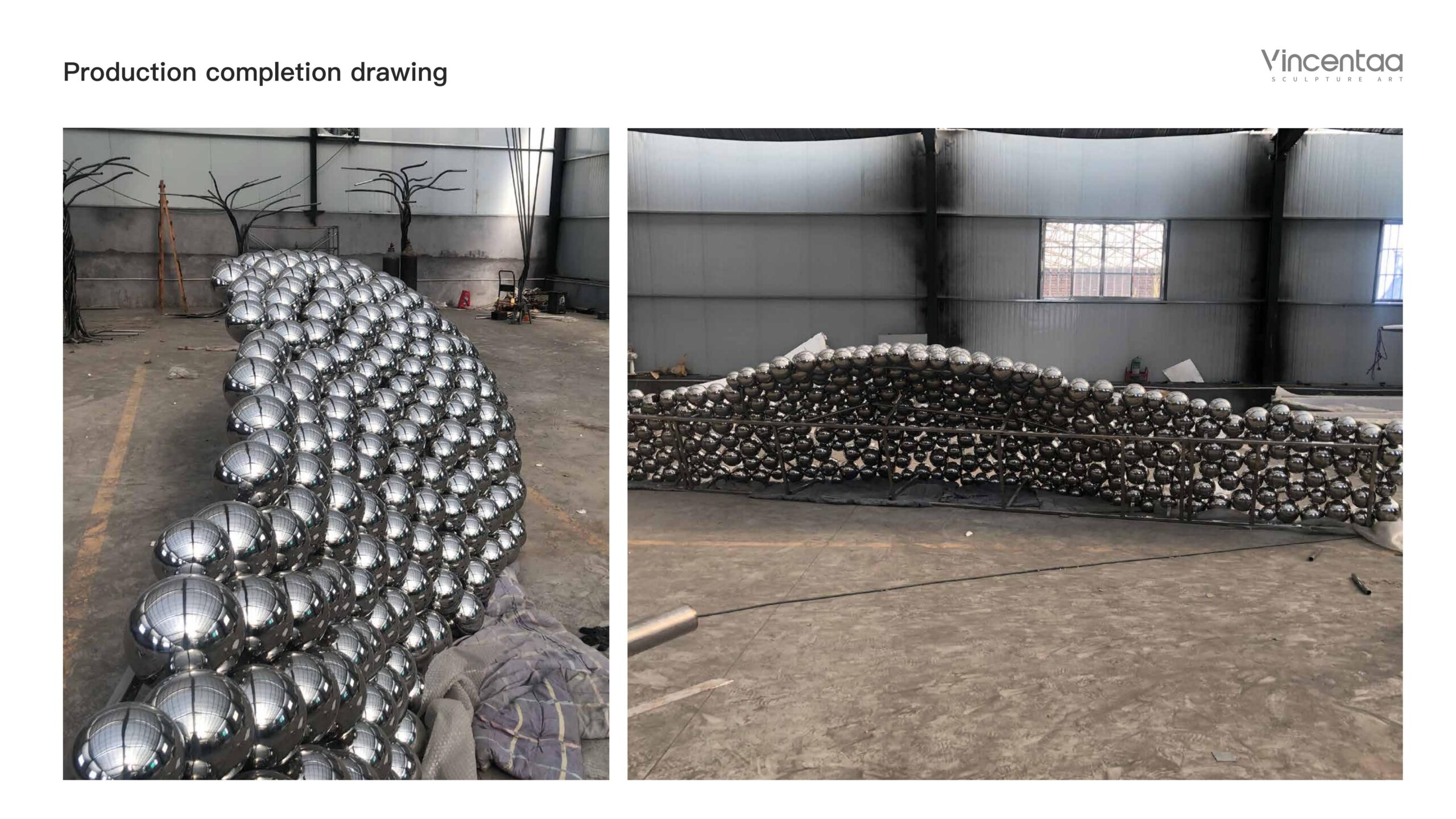 Данный проект представляет собой индивидуальное настенное панно в виде шаров, созданное для общественного пространства в Бахрейне. Общий размер композиции — 7660×1661 мм. Материал — пищевая нержавеющая сталь марки 304 с зеркальной полировкой.