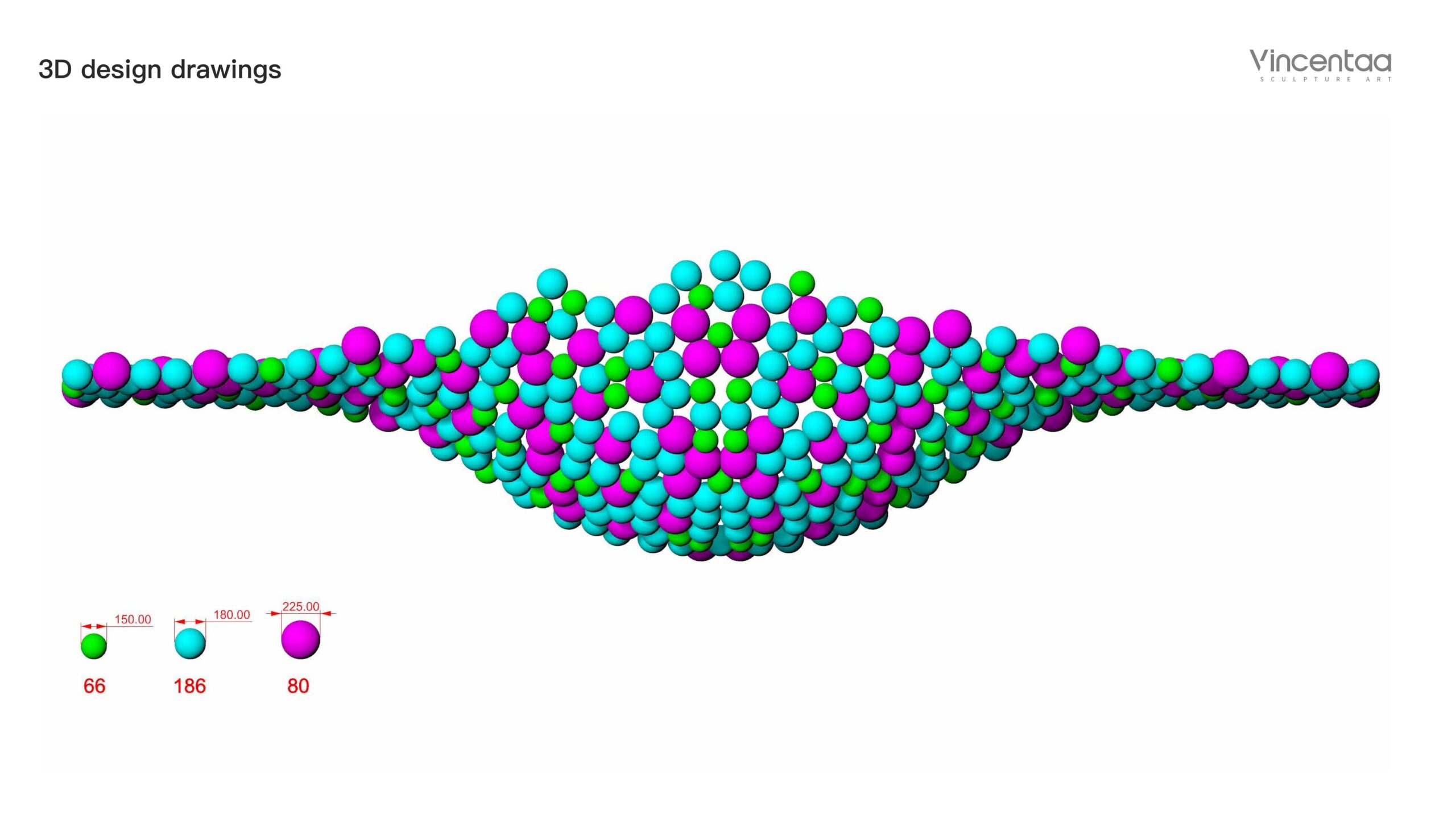 Композиция состоит из стальных шаров трёх диаметров: 150 мм, 180 мм и 225 мм. Крепление выполнено с помощью технологии точной сварки, что создает богатую слоистость и игру света и тени. Панно не только соответствует эстетике современного пространства, но и обладает превосходной антикоррозийной стойкостью и устойчивостью к погодным условиям, подходя для внутренней и наружной отделки стен.
