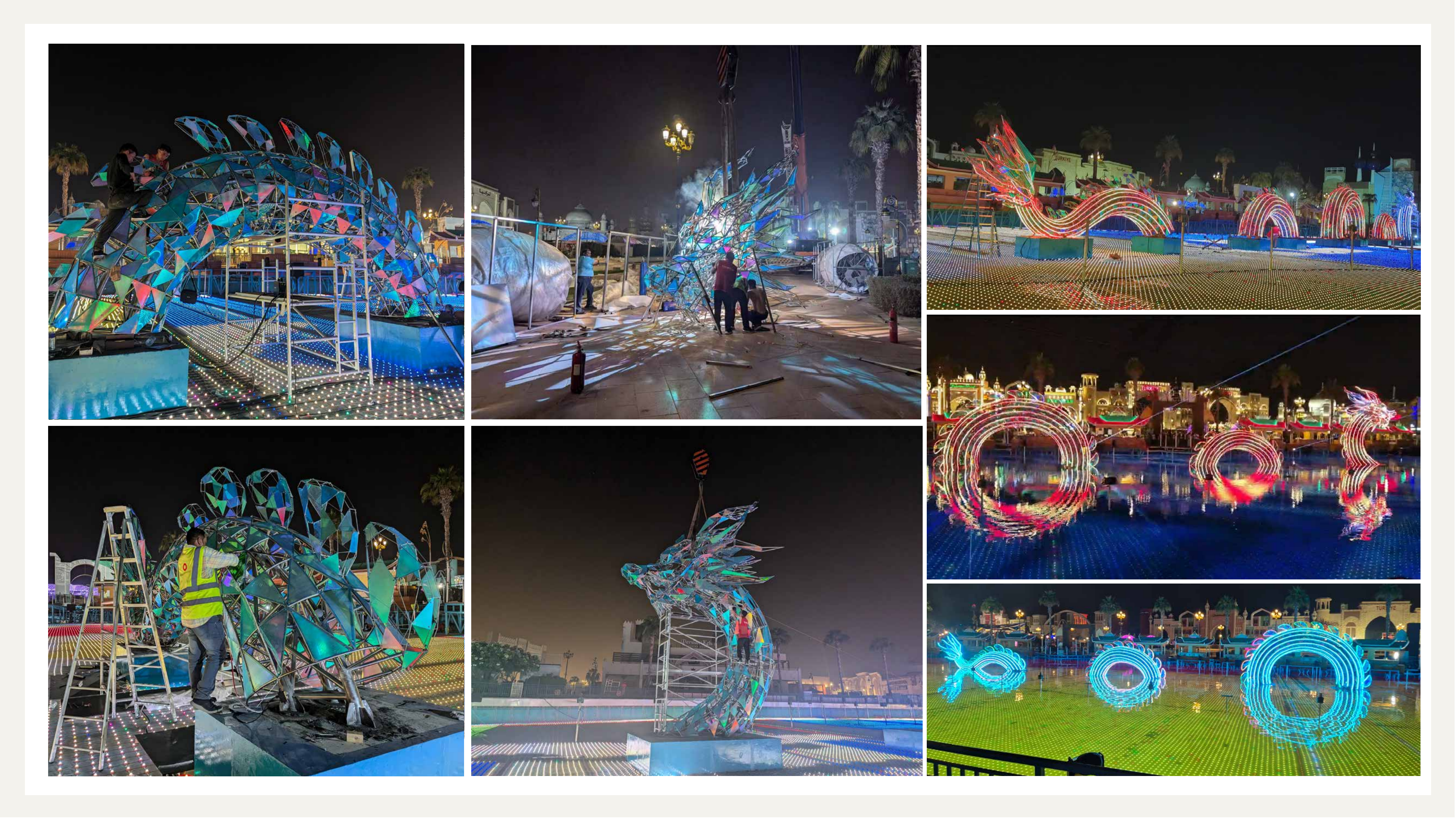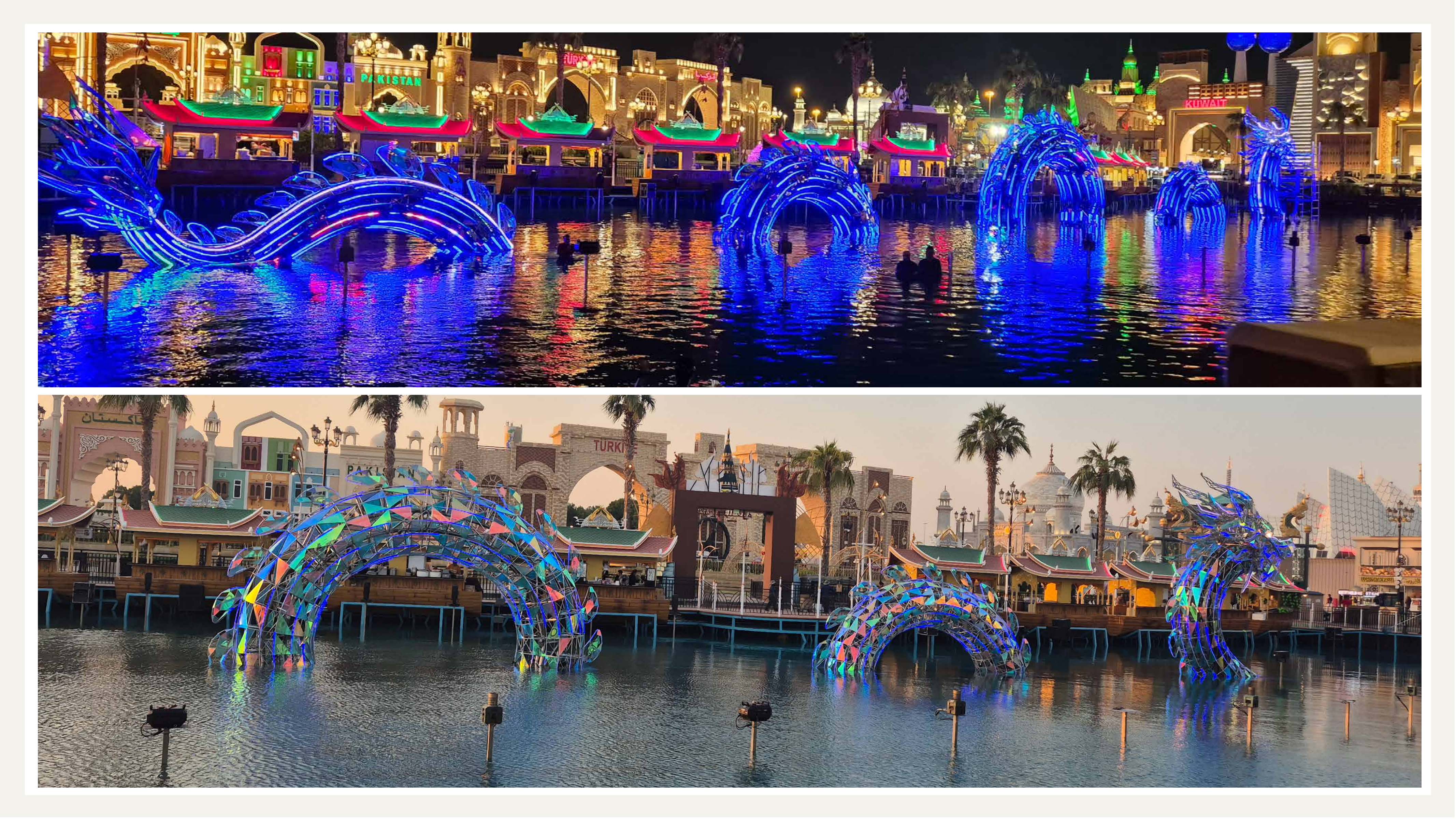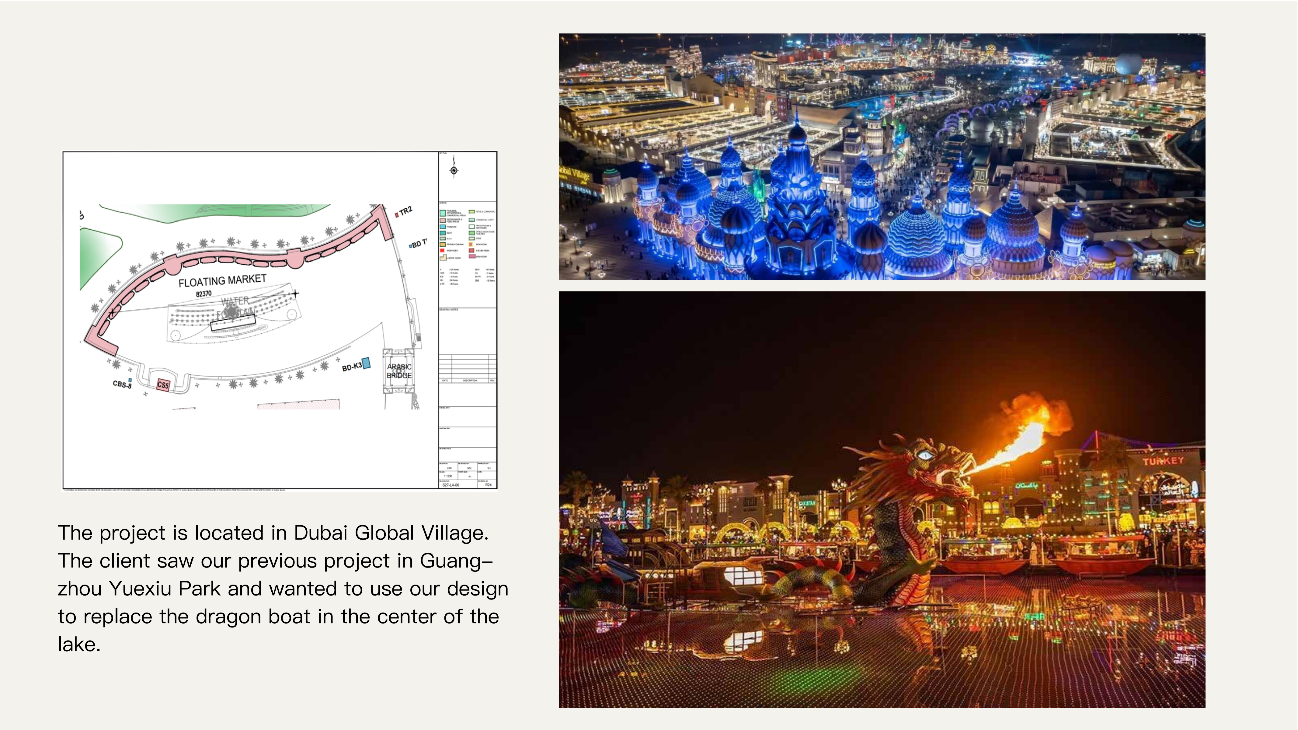 Данный проект реализован в глобальной деревне Дубая (Dubai Global Village). Заказчик, увидев наш предыдущий проект в парке Юэсю в Гуанчжоу, пожелал заменить лодку-дракон в центре озера на нашу разработку.